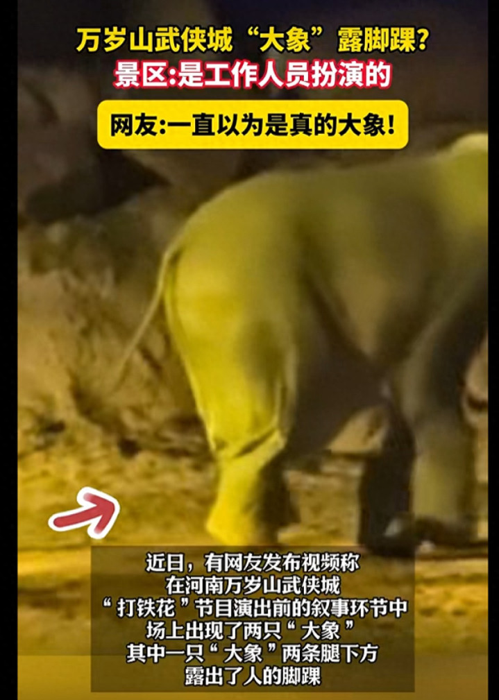 近日,网友发视频称,在河南万岁山武侠城的“打铁花”节目演出前的故事叙事环节中,场上出现了两只“大象”。其中一只“大象”的两条腿下方,露出了人的脚踝。