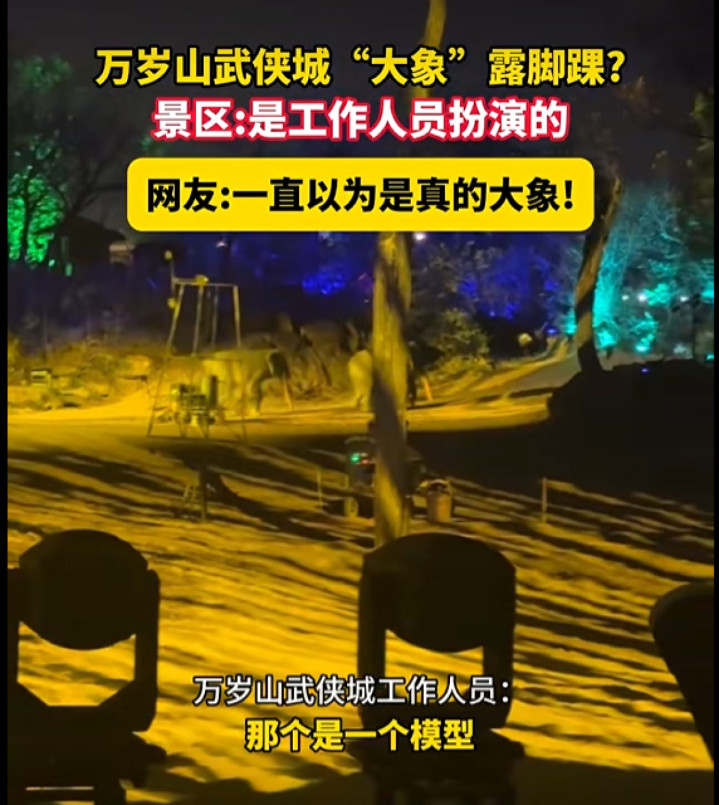 4月15日,记者致电万岁山武侠城。工作人员表示,景区从没饲养过大象,节目中的大象是模型,由4名工作人员共同扮演。